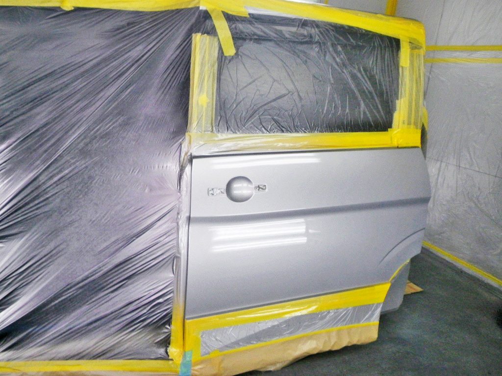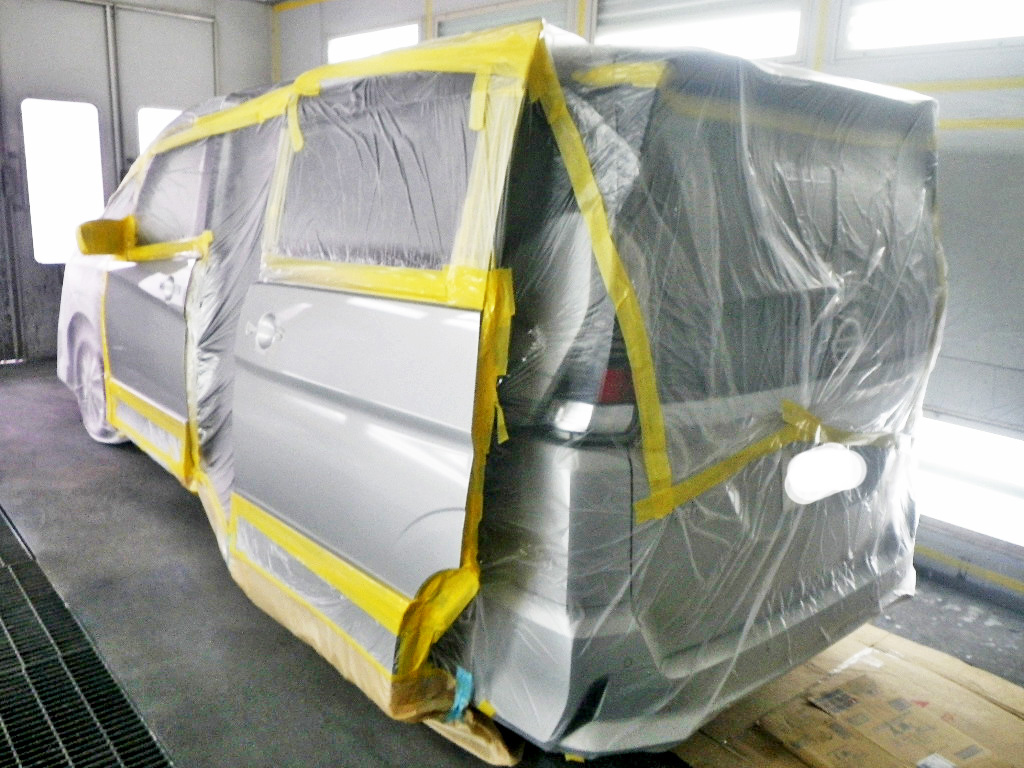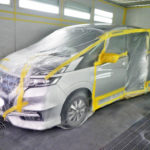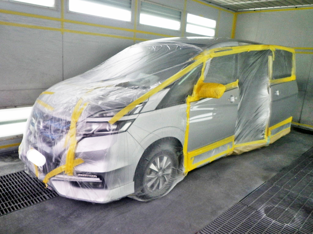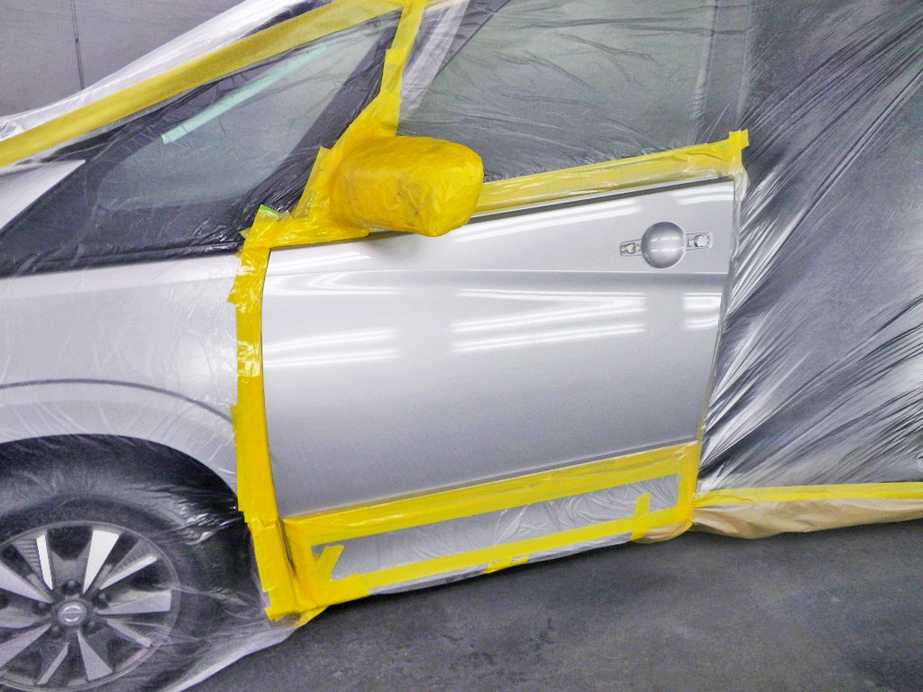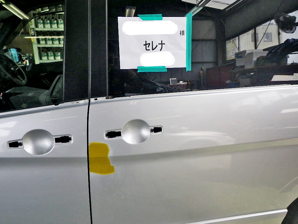 日産 セレナの板金・塗装の様子です。風が強い日に、駐車場に停めていた際に隣に駐車していた車のドアが、強風にあおられてバンっと当たってしまったそうです。