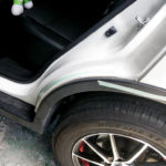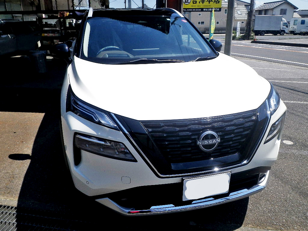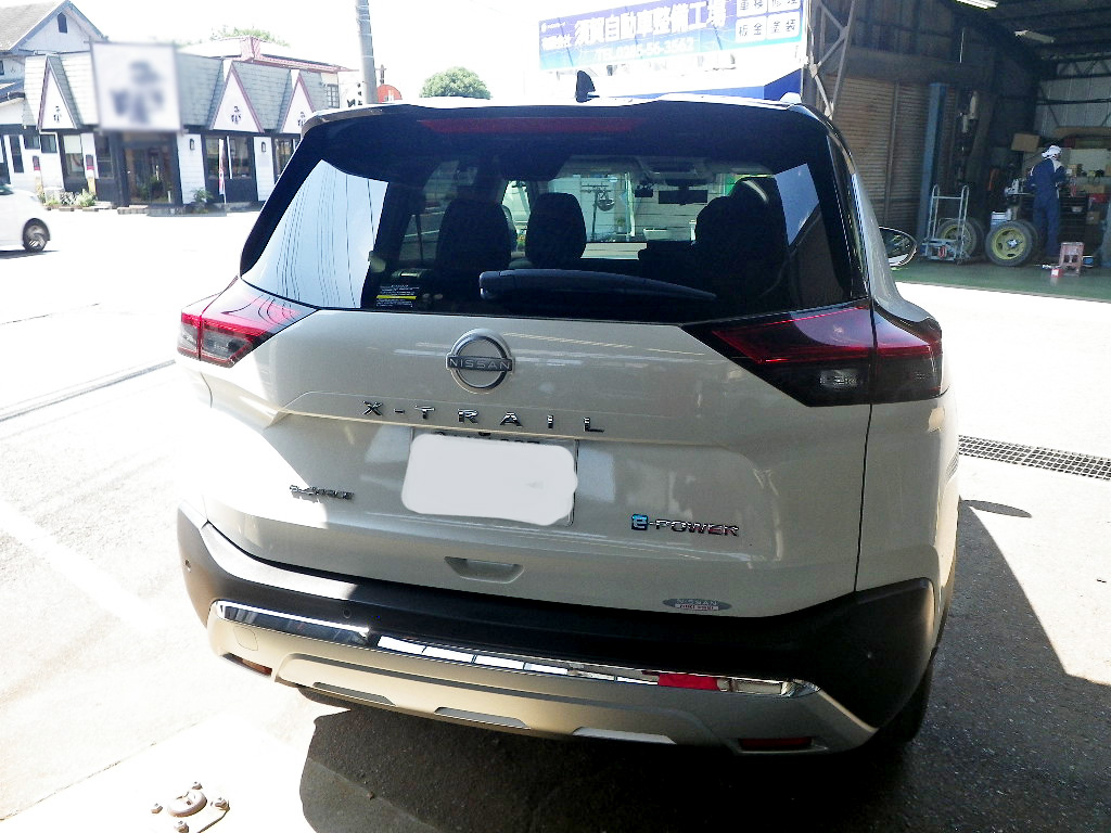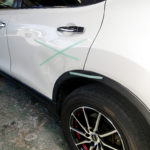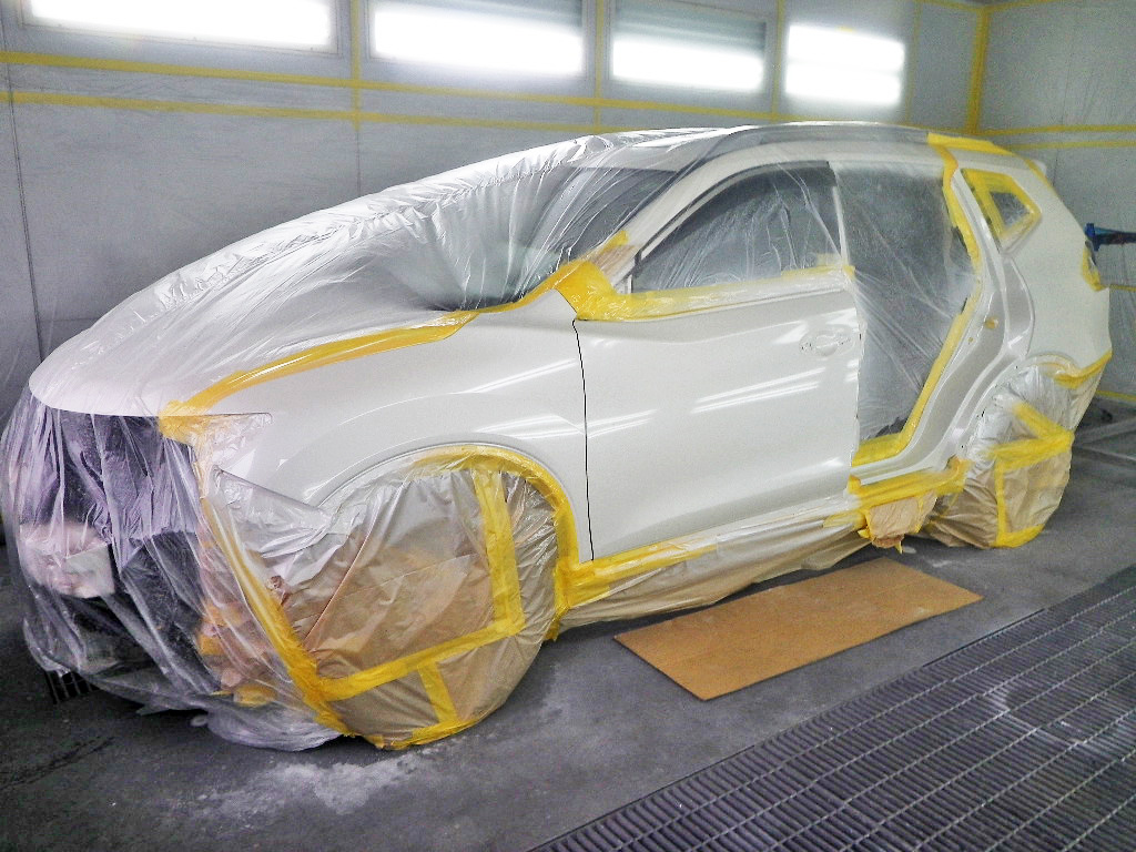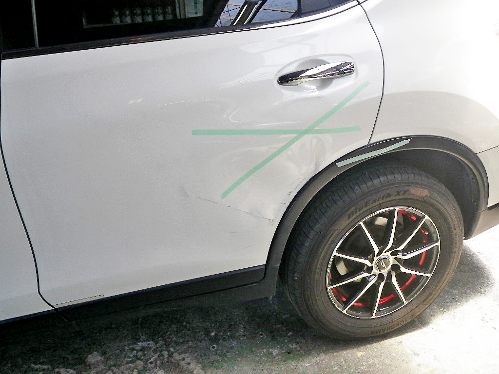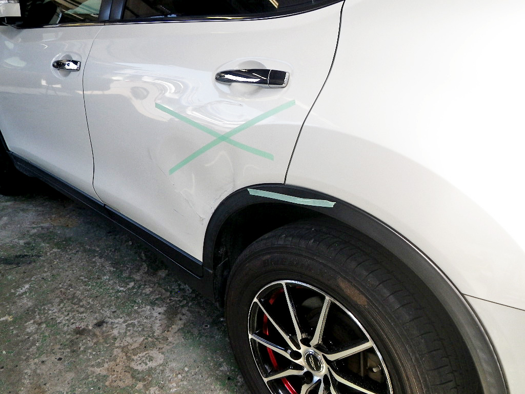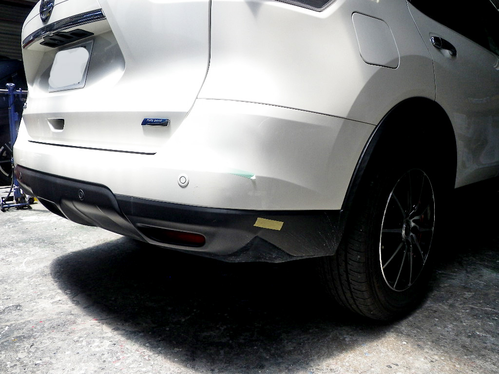 日産 エクストレイルの板金・塗装の様子です。車両全体に及び細かな傷がありました。普段から大切に乗っていても、やはり車は車道を走っていると知らず知らずのうちに小さなダメージを日々受けているんですね。