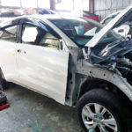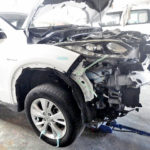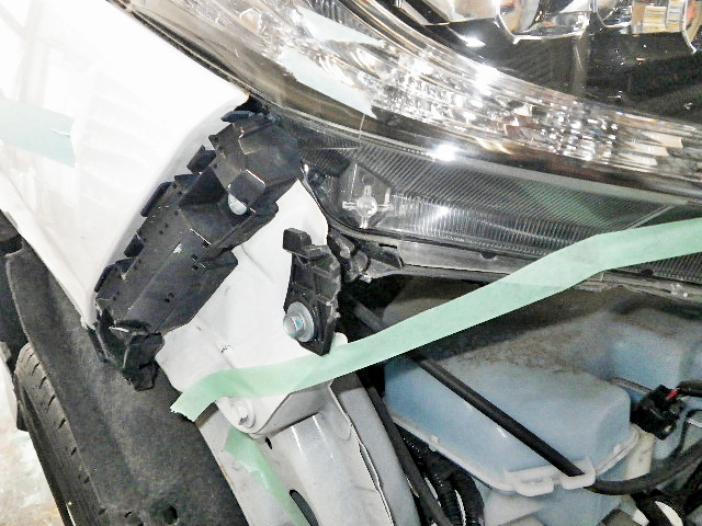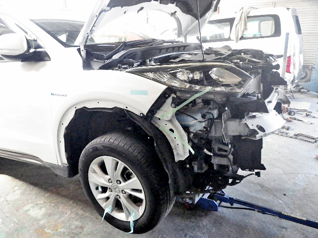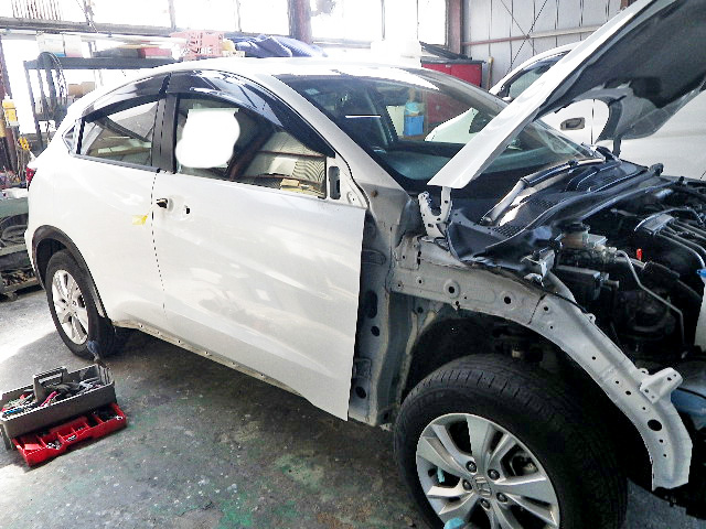 ホンダ ヴェゼルの板金・塗装の様子です。事故により車が傷ついてしまったのでそちらを補修していきます。