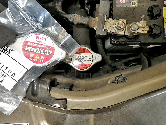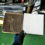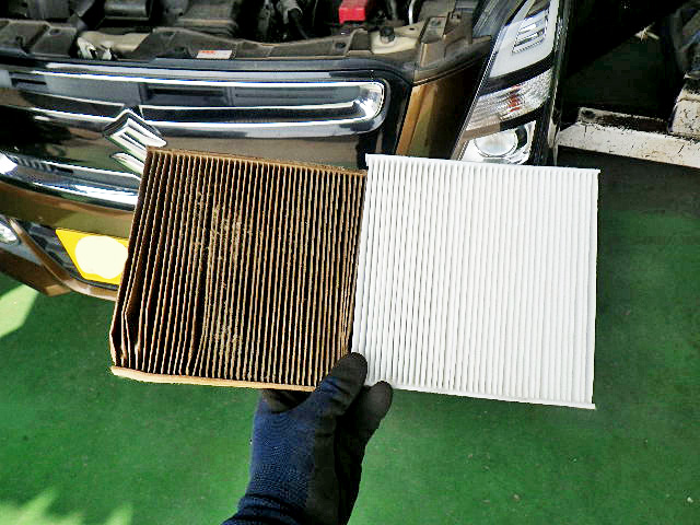 スズキ ワゴンRの車検・整備の様子です。エアコンフィルターを交換しました。この方はおタバコを吸われるので、尋常じゃないくらい汚れておりましたので交換が必要です。またラジエーターキャップも交換しました。